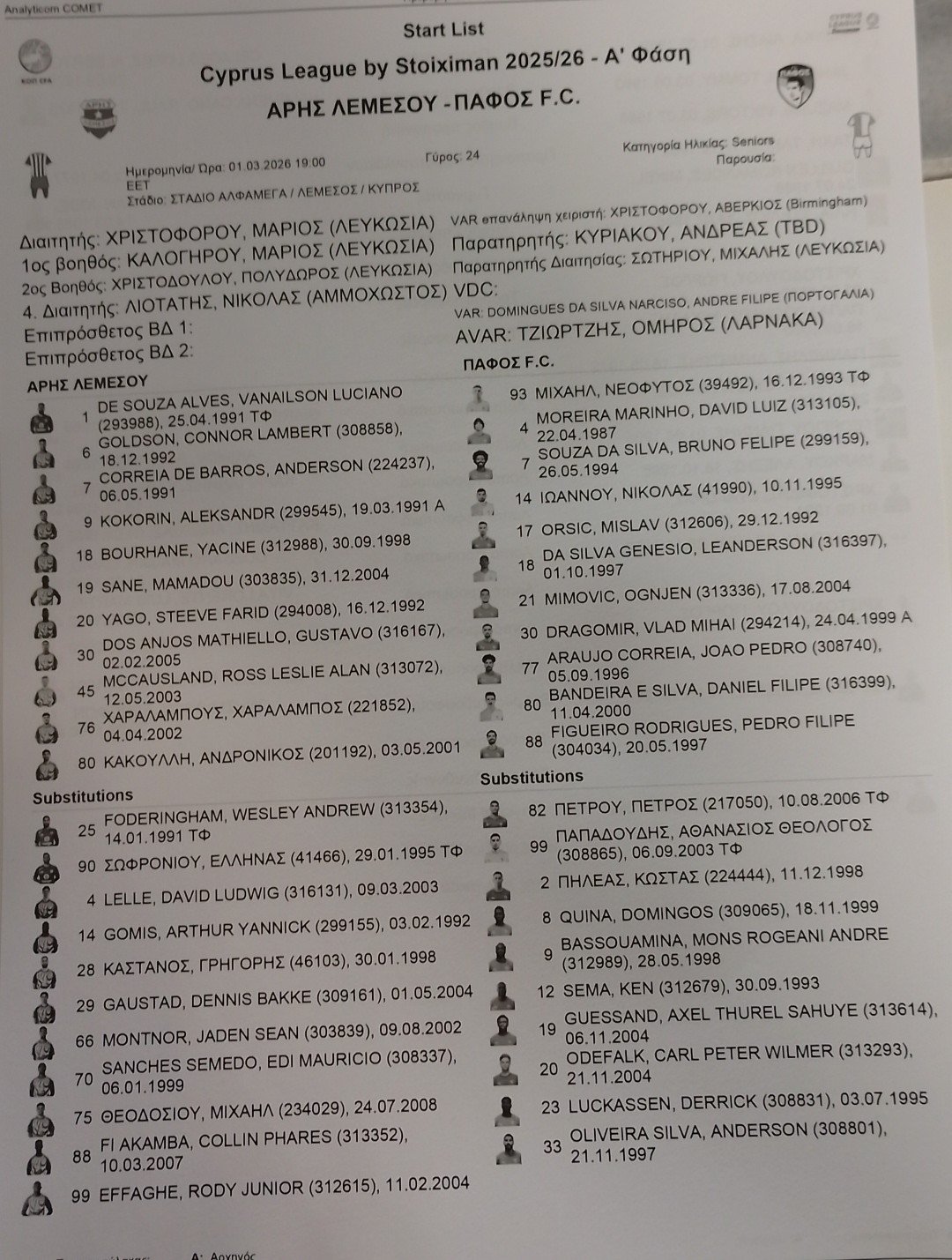 Το φύλλο αγώνα με τις αρχικές 11-άδες και τους αναπληρωματικούς: