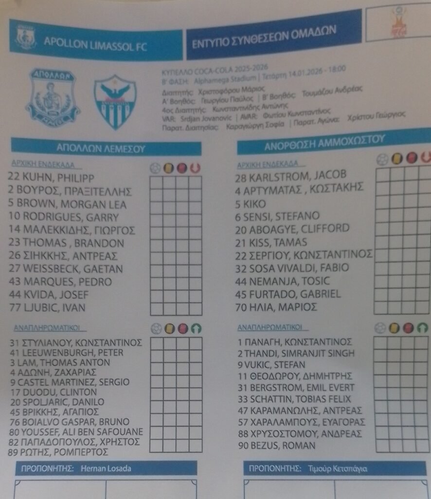 Η ομάδα του Απόλλωνα σήμερα δίνει τον τέταρτο της αγώνα μετά την αποδέσμευση του Σωφρόνη Αυγουστή από τον πάγκο της ομάδας, υπό την τεχνική ηγεσία του Αργεντινού Hernan Losada και μετρά τρεις σερί νίκες. Στο ντεμπούτο του την 15η αγωνιστική οι ‘’Γαλανόλευκοι’’ νίκησαν μέσα στο ‘’Αμμόχωστος’’ την Krasava ENY με 0-1, την 16η αγωνιστική πέτυχαν τεράστια νίκη με εξαιρετική εμφάνιση κόντρα στην Πάφος F.C. με σκορ 2-1 εδώ στο στάδιο «Άλφαμέγα» και την 17η αγωνιστική πήραν το διπλό με 0-1, μέσα στο «Τάσος Μάρκου» με αντίπαλο την Ένωση Νέων Παραλιμνίου.  Σήμερα οι ποδοσφαιριστές της Λεμεσιανής ομάδας στην παρουσία 6500+ οπαδών του που έχουν μια φανταστική παρουσία, είναι αποφασισμένοι να συνεχίσουν με την ίδια ένταση και πάθος  για να πάρουν την πολυπόθητη πρόκριση στα Προημιτελικά του Κυπέλλου.