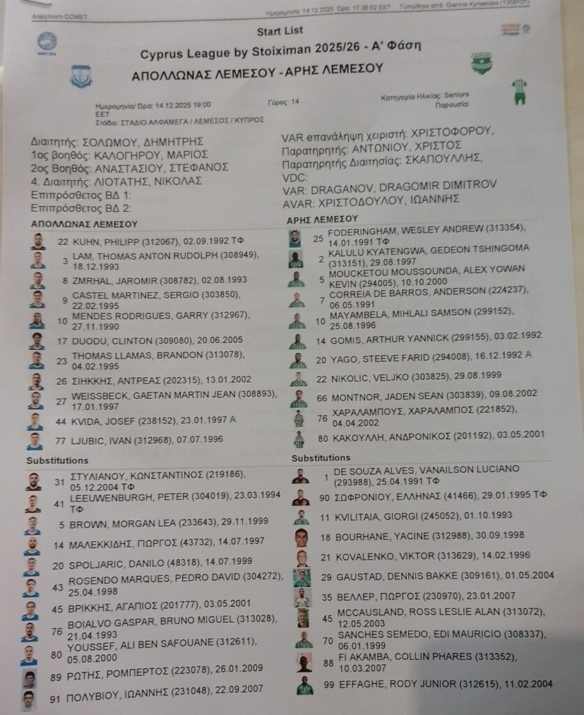 Δείτε το φύλλο αγώνα με τις 11-άδες και τους αναπληρωματικούς.